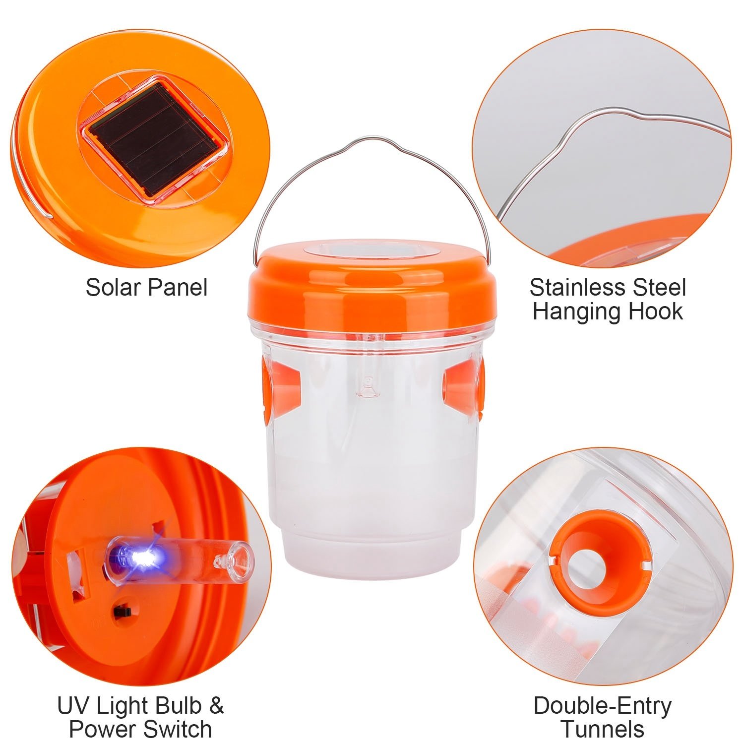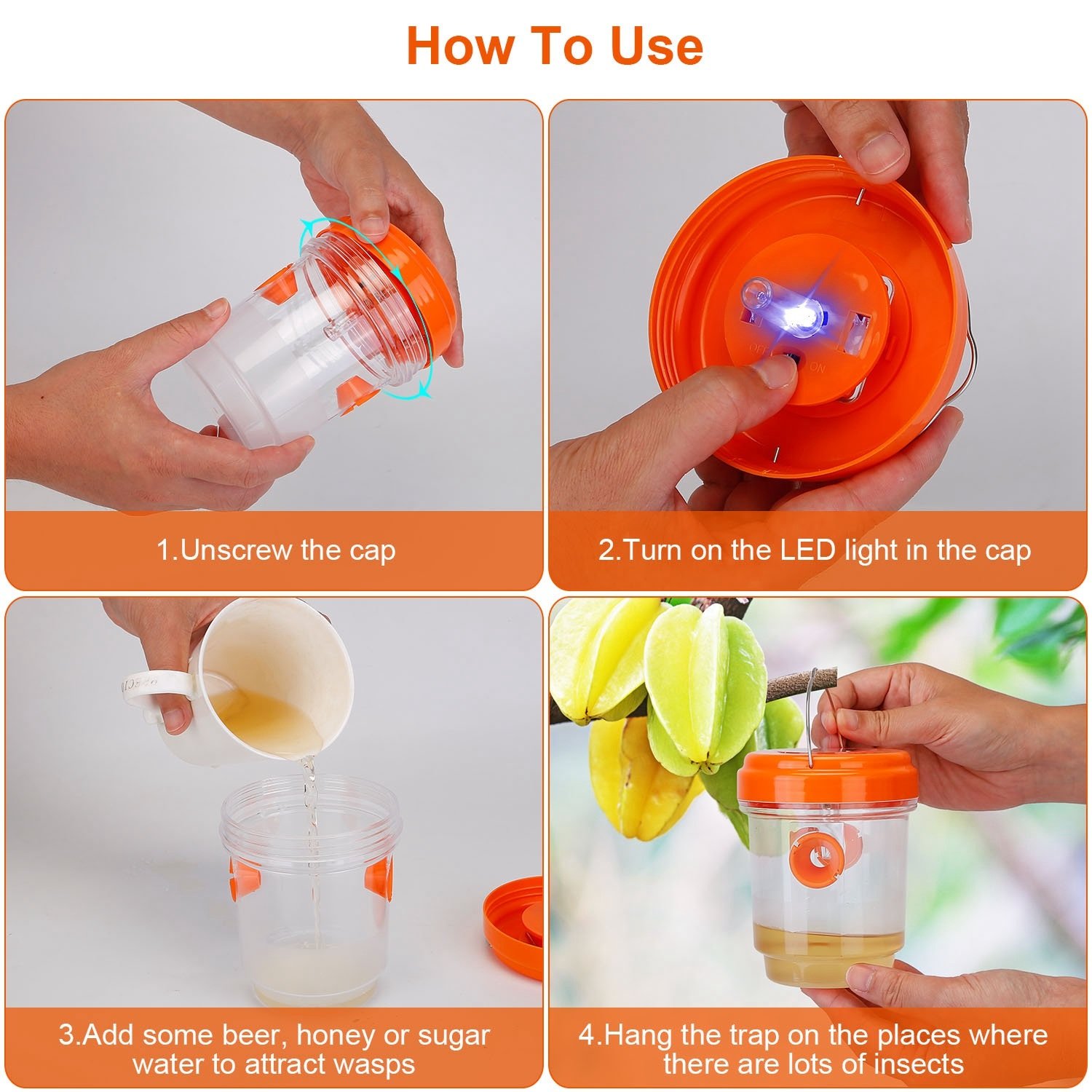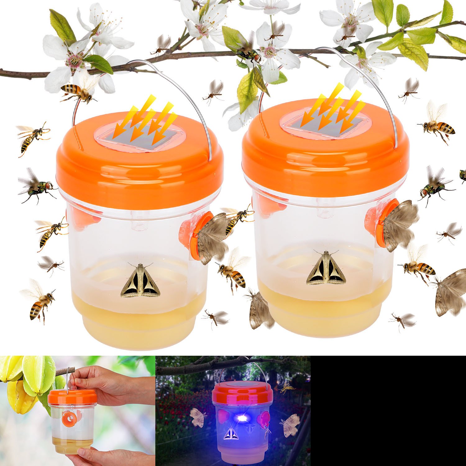 *Easy To Trap*:Simply add some sugar water; honey; juice or beer as baits in the bottle; then turn the switch on and hang it on the tree or place it in the garden or any areas you need.