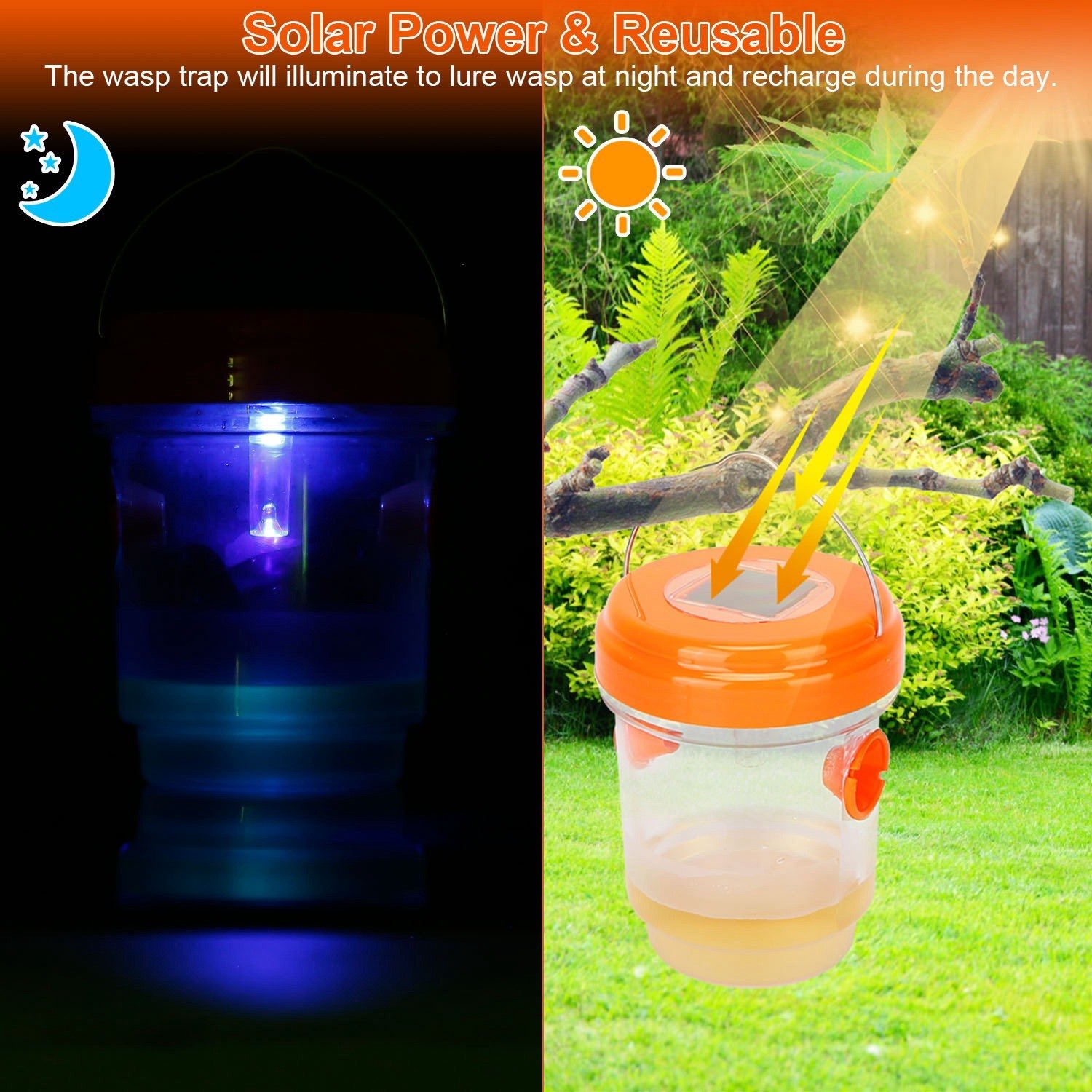 *Solar Power & Reusable*:Designed with solar panel; the wasp trap will illuminate to lure wasp at night and recharge during the day. No chemicals or toxic ingredients; safe to use around children and animals.