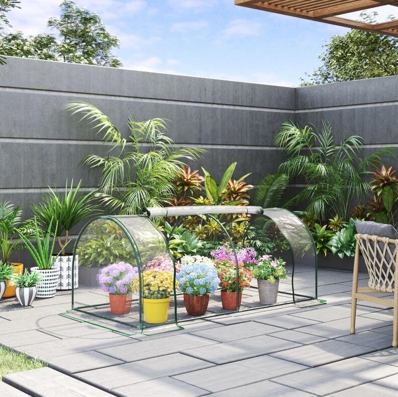 - Patio greenhouse with strong steel tubing and a protective PVC cover
