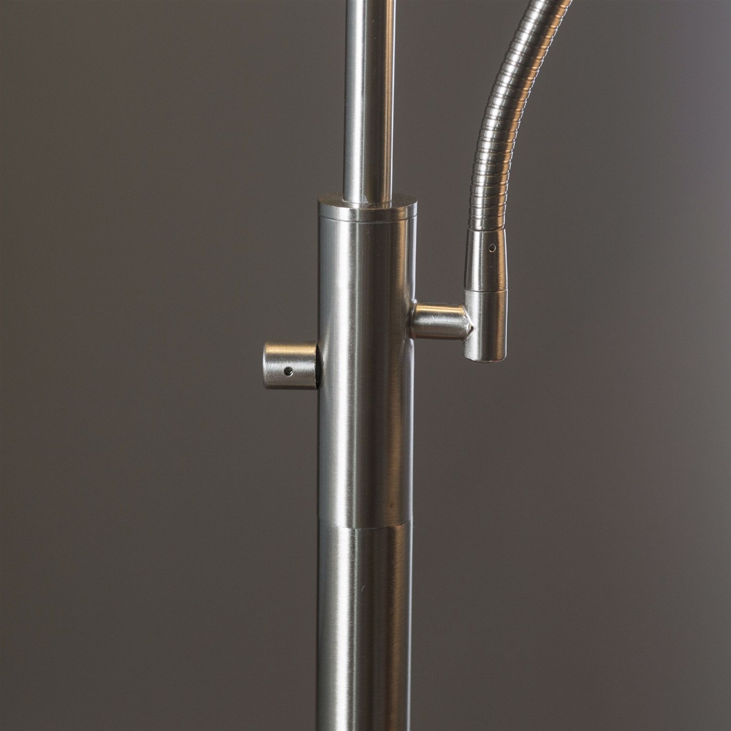 • Sturdy metal pole base/gooseneck lamp in satin-steel finish